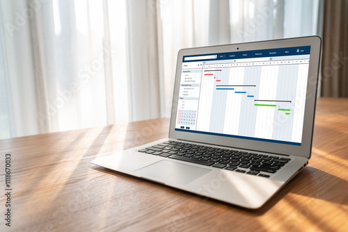 Project planning software for modish business project management on the computer screen showing timeline chart of the team project