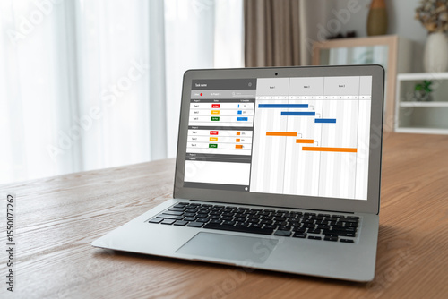 Project planning software for modish business project management on the computer screen showing timeline chart of the team project