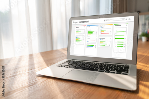 Project planning software for modish business project management on the computer screen showing timeline chart of the team project
