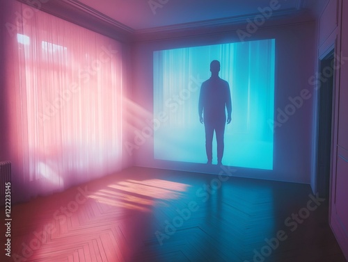 projected figure, pink and blue light, empty room, minimalist setting, spectral scene