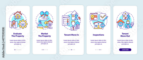 Property management operations onboarding mobile app screen. Business walkthrough 5 steps graphic instructions pages with linear concepts. UI, UX, GUI template. Myriad Pro-Bold, Regular fonts used