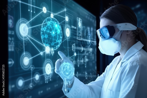 Protected Scientist Inspecting Test Tube: Molecular Display on Virtual Interface Background.Generative AI