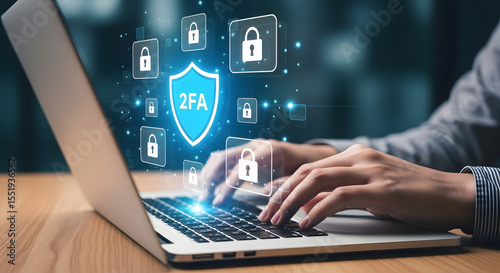 Protecting digital access with two-factor authentication and glowing lock icons on a laptop.