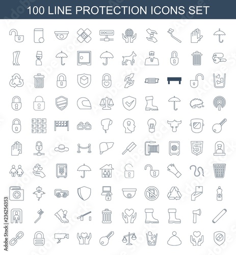 protection icons. Set of 100 line protection icons included health insurance, hand with heart, winter hat on white background. Editable protection icons for web, mobile and infographics.