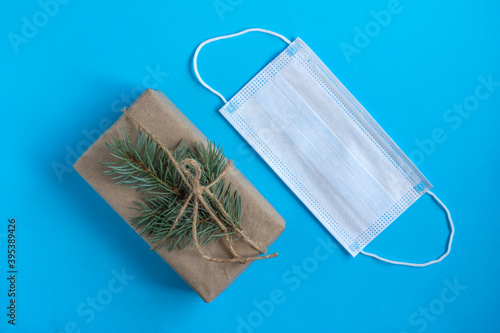Protective face mask and a Christmas gift on a blue background. Christmas, new year during the coronavirus pandemic, the COVID holiday. Safety during the winter holidays Covid-19. Top view