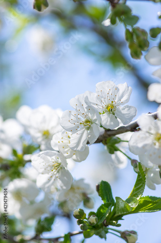Prunus cerasus flowering tree flowers, group of beautiful white petals tart dwarf cherry flowers in bloom