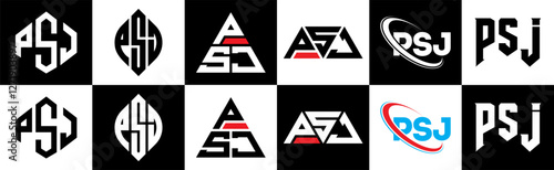 PSJ letter logo design in six style. PSJ polygon, circle, triangle, hexagon, flat and simple style with black and white color variation letter logo set in one artboard. PSJ minimalist and classic logo