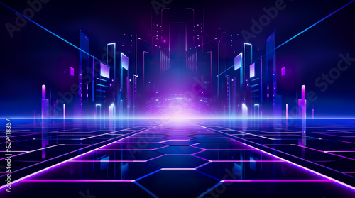 Psychedelic Abstract Futuristic Neon. Fluorescent Sci Fi. Glow Laser Showcase Stage Dark Room. Retro Modern