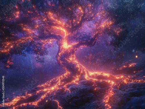 Psychedelic cosmic tree, branches in shimmering digital holograms, planetary roots, vibrant fantasy tones, low perspective, intricate and high-detail design, surreal glow