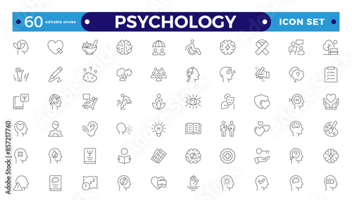 Psychology and mental line icons collection. Big UI icon set in a flat design.Set of positive thinking icons. Containing self-care, optimism, be loved, healthy lifestyle, Editable stroke outline icon.