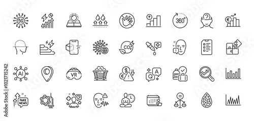 Psychology, Coronavirus and Line graph line icons pack. AI, Question and Answer, Map pin icons. Augmented reality, Puzzle, Analytics web icon. Vr, Sun energy, Consumption growth pictogram. Vector
