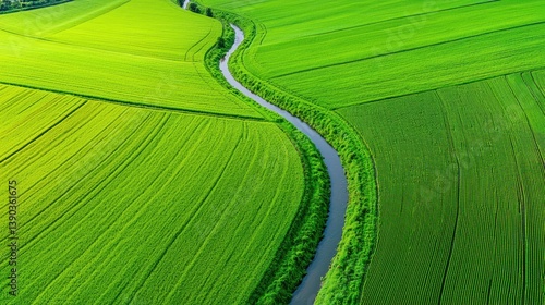 Public Balance Treatment Style. Lush green fields with a winding river in a vibrant landscape.