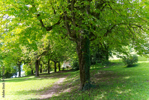 Public park with idyllic tree alley at lakeshore of City of Bled on a blue cloudy summer day. Photo taken August 8th, 2023, Bled, Slovenia.