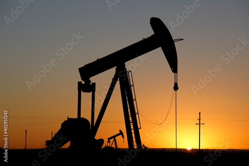 Pumpjacks, the sunset of New Mexico oil field, shot near Carlsbad.
