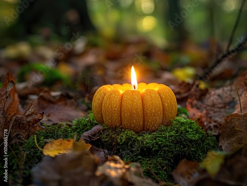 Pumpkin shaped candle surrounded by leaves and moss in a forest setting