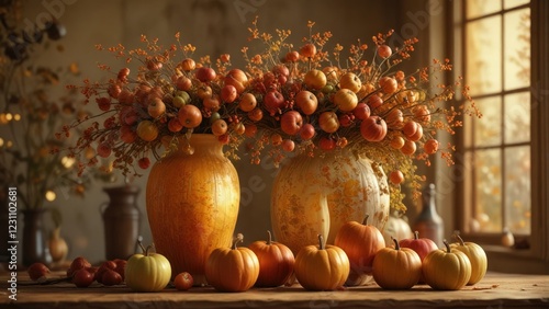 Pumpkins and apples in a delicate, hand-painted vase against an autumnal background with warm lighting effects, autumnal colors, still life