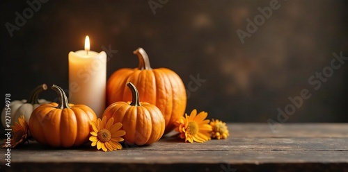 Pumpkins and daisies on a wooden table with a warm candlelight glow, candle, pumpkin