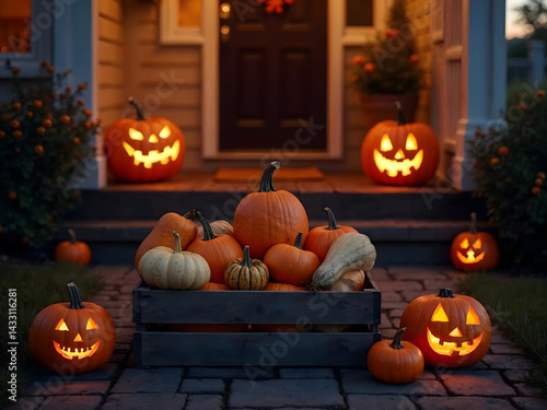 Pumpkins and Jack-o'-lanterns on Front Porch for Holiday
