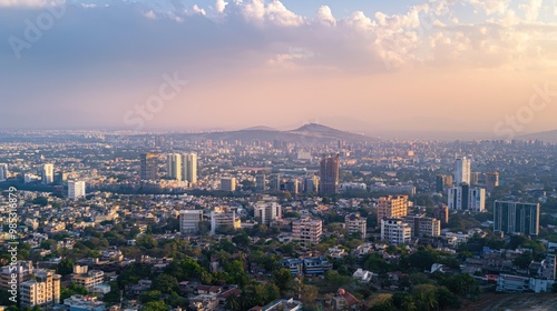 Pune cityscape in Maharashtra, India. Aerial shot of metropolis with modern skyscrapers and urban landscape. Hazy sky with smog and foggy atmosphere. City buildings and structures in the foreground.