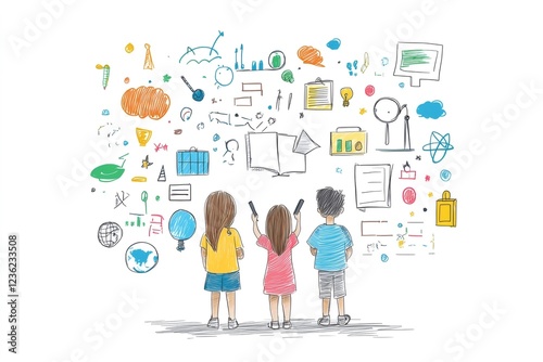 Pupils watching educational and scientific colorful drawings representing different school subjects
