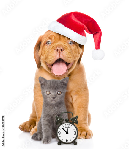 Puppy in red santa hat and kitten sitting together with alarm clock. isolated on white background