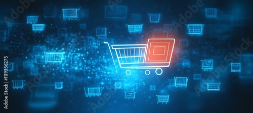 Purchase online concept with glowing digital shopping cart icons on abstract blue background, Generative Ai