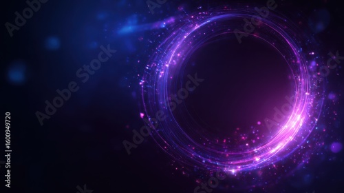 Purple abstract glowing light effect circles with sparkles on dark background. Abstract background for science, universe and cosmos, futuristic digital technologies, energy.