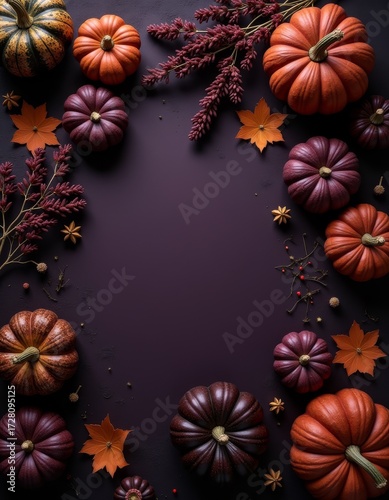 purple and golden pumpkins with fall decorations around on dark ground top view background with space for text border background spooky illustration decoration