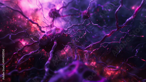 Purple and red image of a brain with many purple and red lines. Modern cell research. Abstract background.
