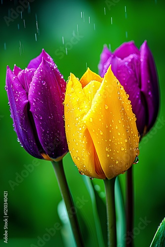 Purple and yellow tulips swaying in a gentle spring rain, surrounded by a lush and colorful garden.