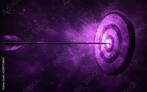 Purple background with a bullseye target and an arrow lodged perfectly in the center, symbolizing focus, goal completion, and success in a dynamic, motivational composition