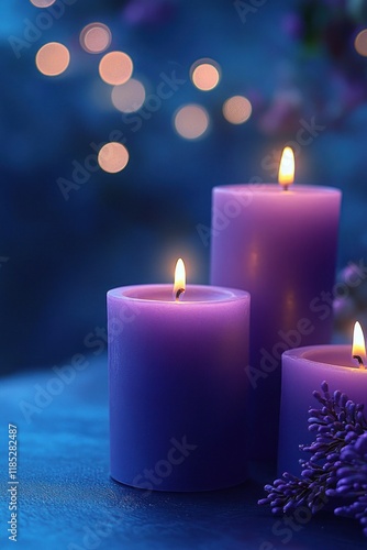 Purple Candles Glow at Night with Bokeh Lights in Dark Blue Background for Advent Celebration and Spiritual Reflection