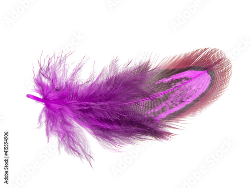 Purple decorative colorful pheasant bird feather isolated on the white background