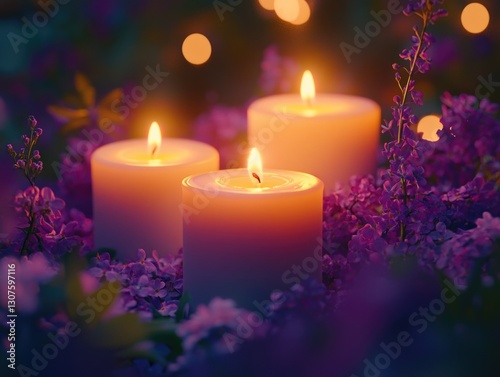 Purple Flowers with Lit Candles