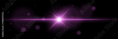 Purple glowing burst with horizontal flare, light particles, radial rays on black background. Concept of energy explosion, sci-fi effect, cosmic flash, digital illumination, star core.