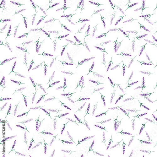 Purple lavender flowers, hand drawn watercolor seamless pattern. Illustration isolated on white background. Can be used for textile, fabric scrapbook and other printed products.