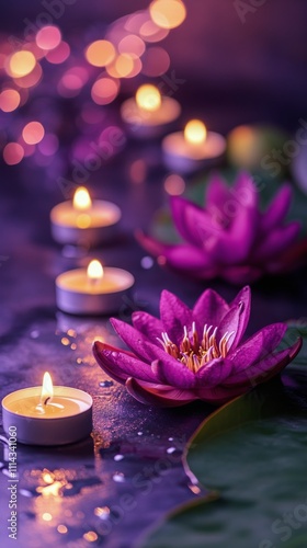 Purple lotus flowers and candles create a serene atmosphere at dusk