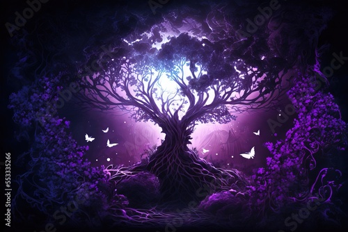 Purple Magical and Ethereal Tree, Reflecting and remembering the arborescent nature of existence. with beautiful violet lightning