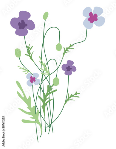 Purple meadow flowers in flat design. Springtime blooming wildflowers. Vector illustration isolated.
