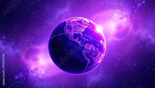Purple planet Earth in outer space. Digital art. Cosmic space background. Abstract globe. Futuristic technology. Starry night sky. Galaxy. Astronomy theme. Virtual environment. Tech design. Global
