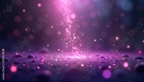 Purple stars fall on dark purple background with glowing bokeh lights creating impressionist painting effect. Abstract cosmic design. Fantasy night sky. Glowing purple, pink light creates nebula-like