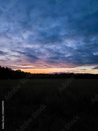 Purple sunset over field of trees. Natural background purple sunset over a field