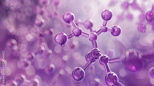 Purple transparent molecule model with intricate atomic bonds floating against a gradient purple background, scientific illustration for chemistry and molecular biology concepts