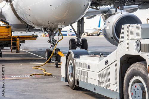 Pushing the airplane back the cart tow tracktor on the front landing gear of the chassis.