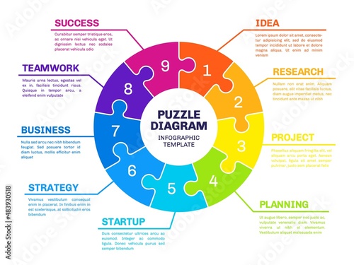 Puzzle circle infographics. Presentation chart pie from jigsaw pieces. Business plan diagram, round structure step by step management tidy vector banner
