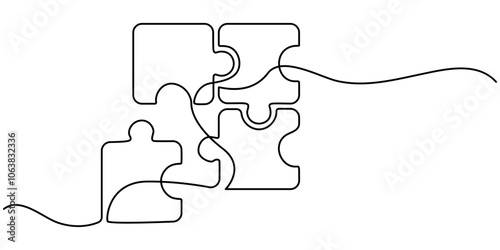 Puzzle pieces continuous line drawing. Problem solving solution business concept Vector illustration, Three puzzle pieces of one continuous line drawn. One hand-drawn line of jigsaw puzzle element.