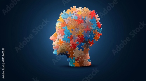 Puzzle pieces of the mind creative conceptual art displaying multicolored brain shape in a dark environment