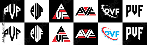 PVF letter logo design in six style. PVF polygon, circle, triangle, hexagon, flat and simple style with black and white color variation letter logo set in one artboard. PVF minimalist and classic logo