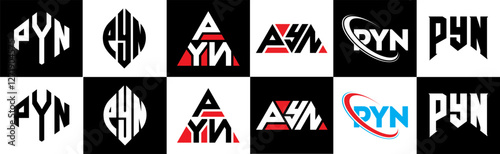 PYN letter logo design in six style. PYN polygon, circle, triangle, hexagon, flat and simple style with black and white color variation letter logo set in one artboard. PYN minimalist and classic logo