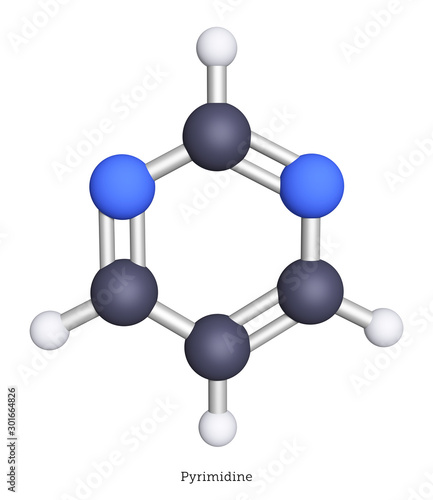 Pyrimidine is an aromatic heterocycle, shown here as a 3d illustration. Three of the DNA/RNA nucleobases are pyrimidine derivatives: cytosine, thymine and uracil.